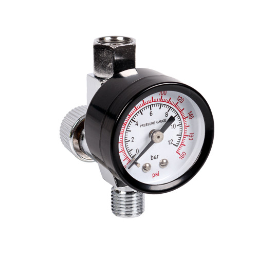 Регулятор давления NTools MANO 9 это устройство, которое устанавливается под малярным пистолетом с целью регулирования давления воздуха, поступающего в пистолет. Регулятор оснащен сальниковым редуктором, который позволяет быстро и точно регулировать воздушный поток с помощью ручки. Оснащен механическим (стрелочным) манометром с диапазоном измерения до 12 бар. Имеет стандартный разъем 1/4”, который подходит к большинству малярных пистолетов.