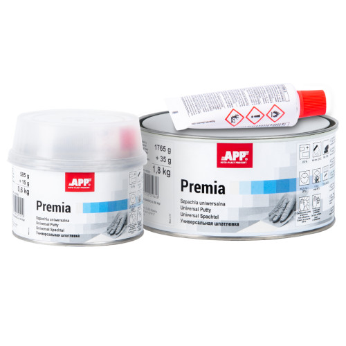 APP PREMIA це багатофункціональна двокомпонентна поліефірна заповнююча шпаклівка. Завдяки кремовій текстурі легко наноситься та моделюється навіть на поверхнях складної форми. Після затвердіння стійка до впливу кислот, основ, розчинників та солей з низькою концентрацією. APP PREMIA призначена для заповнення поглиблень, вирівнювання подряпин при виконанні жерстяних та фарбувальних робіт, а також для інших оздоблювальних робіт. Характеризується дуже гарною адгезією до сталі, оцинкованої сталі, алюмінію та поліефірних ламінатів.