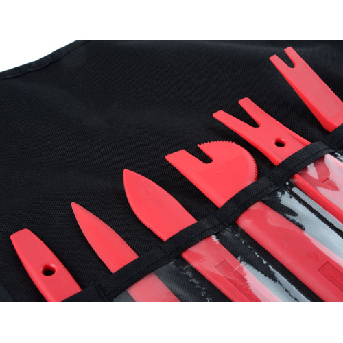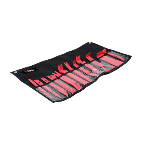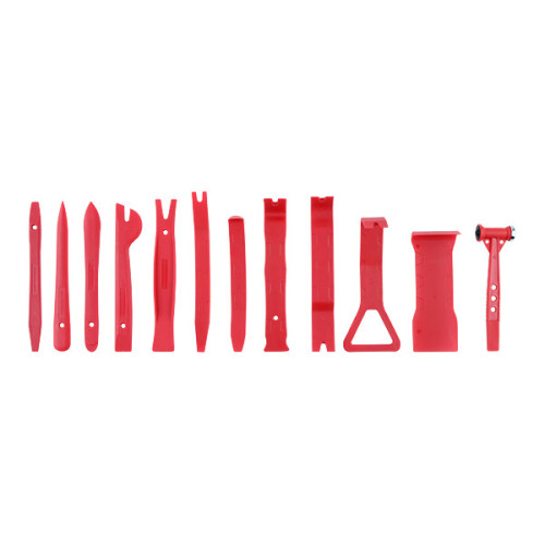 Комплект із 12 інструментів спеціального призначення, необхідних для демонтажу оббивки, молдингів, кліпс та скоб в автомобілях. Спеціально профільовані наймачі забезпечують швидкий демонтаж елементів оббивки салону будь-якого автомобіля.