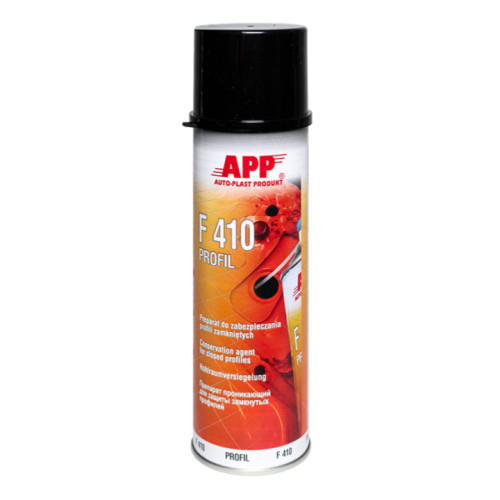 AРР F 410 Aerozol - антикорозійний еластичний препарат на базі воску та насичених добавок для захисту замкнутих профілів та важко доступних місць кузова автомобіля. Має сильні проникні та водовідштовхувальні властивості. Після нетривалого сушіння надовго залишається еластичним та липким захисним шаром. Оптимальна товщина підсохлого шару: ~1 Орт. Тест стійкості до концентрації солі (DAM 39:1): >96 годин.